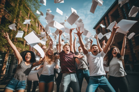 A lively group of individuals toss papers high above their heads, creating a jubilant scene of celebration, Students celebrating after acing an important examination, AI Generated
