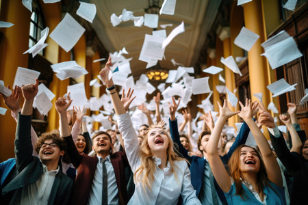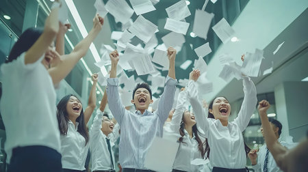 Employees in an office setting enthusiastically tossing papers into the air to celebrate a successful project, Students celebrating after acing an important examination, AI Generated