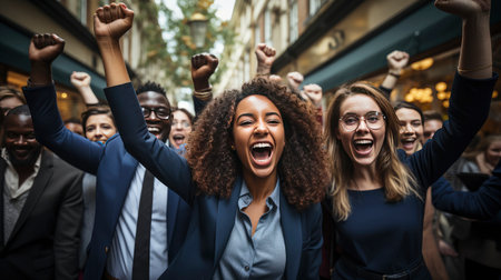 Energetic business team celebrating victory with joyous expressions and raised fists