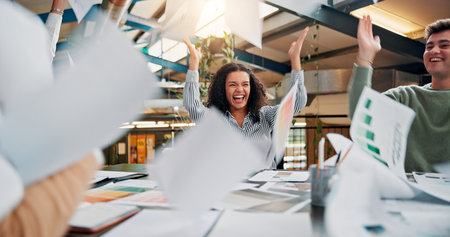 Documents, throw and celebration with business people in meeting for design deal, project profit or success. Achievement, teamwork or paperwork with employees in creative agency for growth target