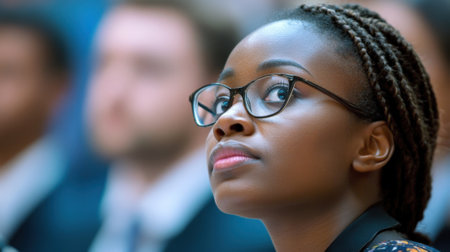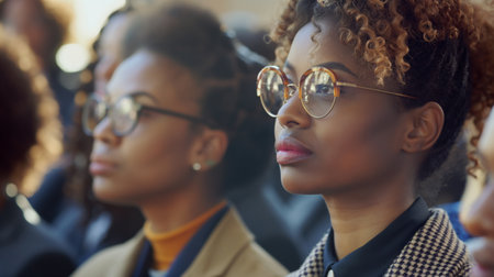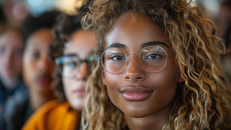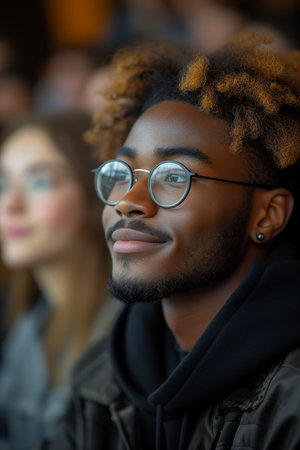 Close-up of a young man with glasses in a diverse audience, all focused on an event or presentation.