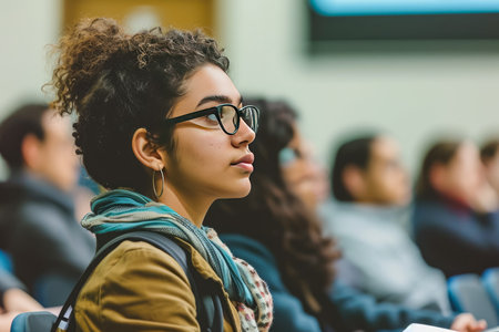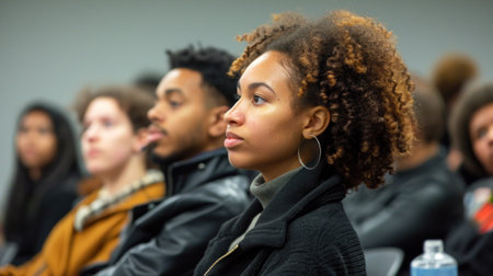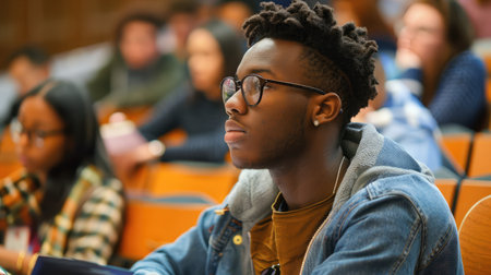 Diverse group of college students attentively listening to a lecture in a university classroom. Concept University Life, Classroom Setting, Diverse Students, Lecture Session, College Education