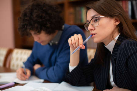 two students a guy and a girl sit in the library at the table and write a note. Getting an education. High quality photo