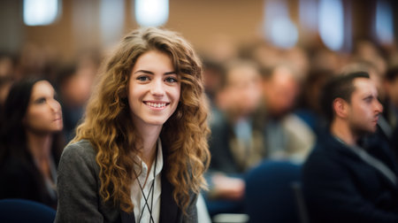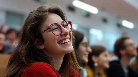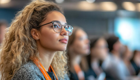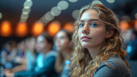 A woman who is wearing glasses is sitting comfortably among a row of people at an engaging conference