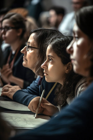 School meeting between parents and children. Close up shot, focus on foreground. Generative AI vertical shot