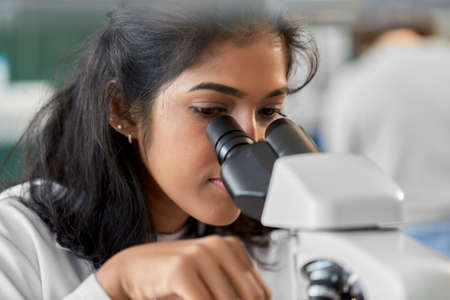 Young female student working at the microscope in the university laboratory in a relaxed atmosphere. Science, chemistry, lab, people