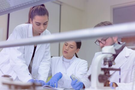 Scientist and students working in lab. Doctor teaching interns to make blood analyzing research. Biotechnology, chemistry, bacteriology, virology and health care concept.