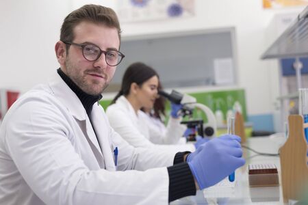 Medicine, genetics, immunology, microbiology concept. Multiethnic group of scientists, Caucasian man and woman, Muslim woman, working at the laboratory with microscope, tubes with liquids and laptop.