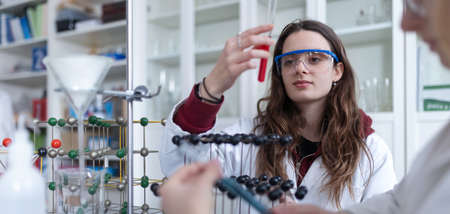Young chemistry students in a sterile laboratory environment are enjoying observing colorful chemical reactions. Science, chemistry, lab, people