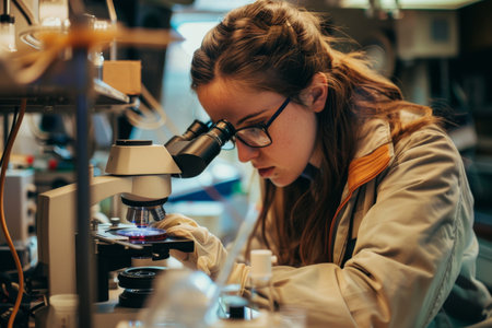 A focused scientist with long hair uses a microscope in a laboratory, exploring scientific research