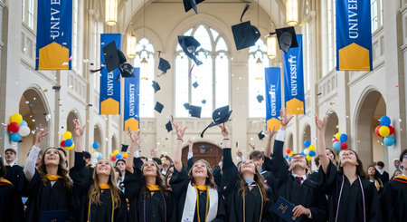 A high-resolution image of a group of graduates in caps and gowns tossing their hats in the air on a university campus, celebrating their accomplishment together