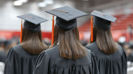 Back view of graduates in mortar boards and bachelor gowns on graduation ceremony at the university. Successful graduation from college or high school. Generative AI