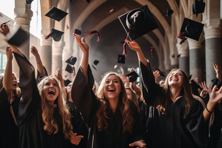 Graduates wearing caps and gowns experiencing a commencement event, celebrating academic achievement and success in a grand hall with confetti falling