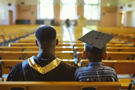 Graduates facing future, bokeh lights in graduation ceremony, anticipation and pride.