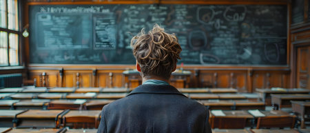 Male teacher giving a lesson in front of a chalkboard in a classroom setting. Concept Education, Classroom, Teaching, Learning, Chalkboard