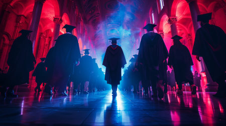 A group of students in graduation attire walking through an architecturally grand space, illuminated by colorful lights. Graduation concept, and bright future illuminated by the glow of knowledge