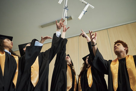 Group of diverse university young students wearing graduation gowns celebrating by tossing diplomas in air, standing together indoors, showing excitement and achievement during ceremony
