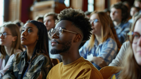 Diverse group of college students attentively listening to a lecture in a university classroom. Concept University Life, Classroom Setting, Diverse Students, Lecture Session, College Education