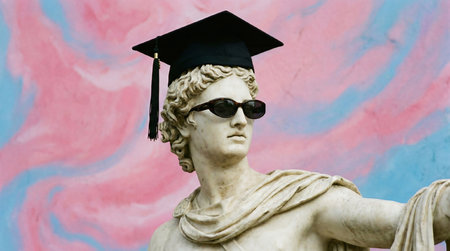 Sculpture of Apollo wearing an academic cap and sunglasses on a pink and blue background