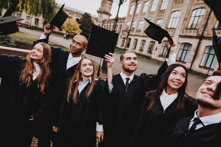 Caps Up. Graduate. Good Mood. Best Friends. Finish Studies. Group of Young People. Have Fun. Architecture. University. Students. Study Together. Friendship. Cap. Campus. Happiness. Knowledge.