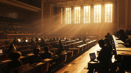 University lecture hall, students and laptops, professor teaching, academic ambiance, detailed scene Generative AI