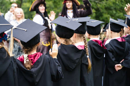 Russia Moscow 30.08.20.Back to primary school. Small children go to first grade.Graduating ceremony.Black gowns,academic caps,tassels.Party with parents, teachers in park, yard. Last day, end of year.
