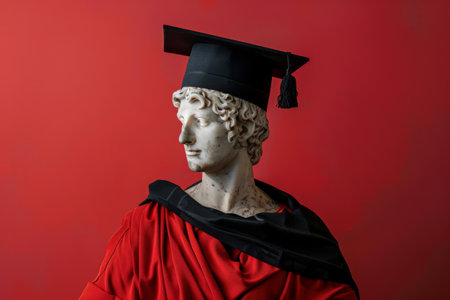 Classic statue of a man wearing a graduation cap on a red background.