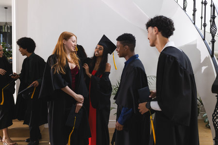 Teens in graduation gowns celebrating together, smiling and chatting indoors. celebration, caps, academic, achievement, youth, togetherness