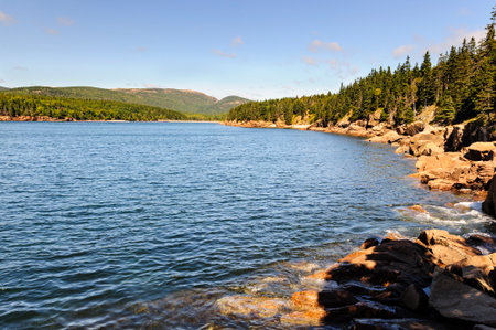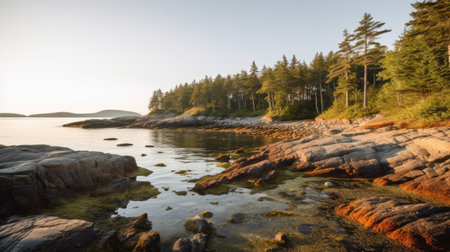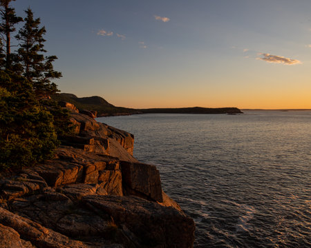 Acadia National Park, ME - USA - Oct. 13, 2021: Horizontal view of sunrise at Newport Cove in Acadia National Park in Maine. Golden hour view of the coast line and forest.