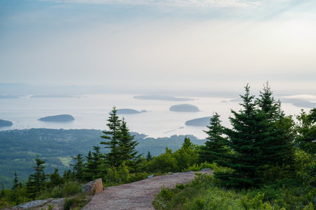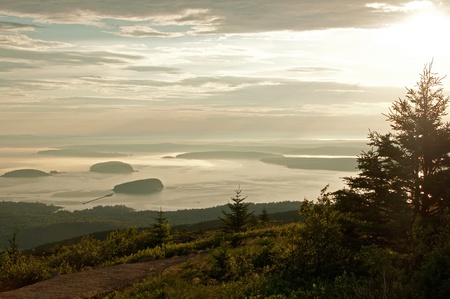 Hazy morning view toward Cranberry Islands from summit of Beech Mountain