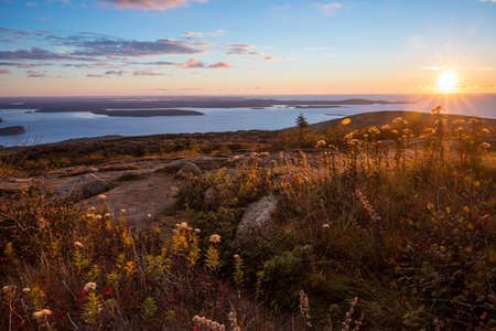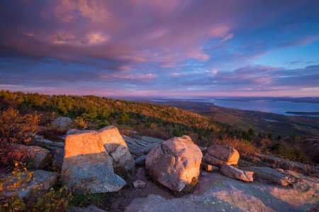 Scenic sunset in Acada National Park as seen from the top of Cadillac Mountain