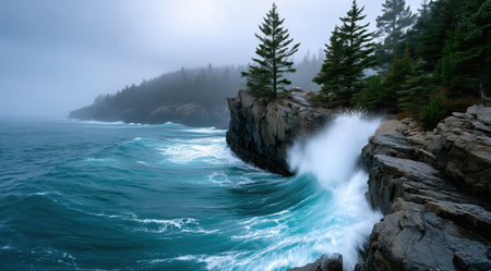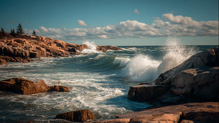 Powerful ocean waves crashing against the rocky coastline of Acadia national park, maine, under a dramatic cloudy sky, showing the raw beauty of natural coastal erosion and resilience