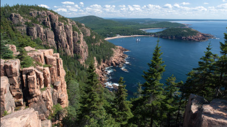 A breathtaking scenic vista overlooking the rugged Atlantic coastline, Sand Beach, and evergreen forests in Acadia National Park, Maine, on a beautiful sunny day.