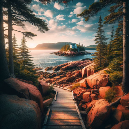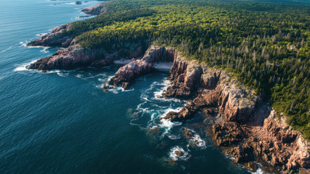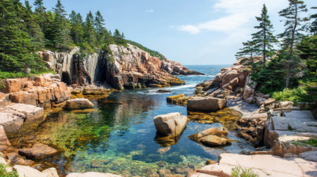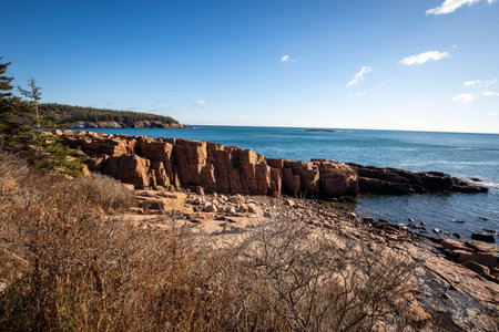A serene view of the Acadia National Park coastline with rugged cliffs. No people, copy space.