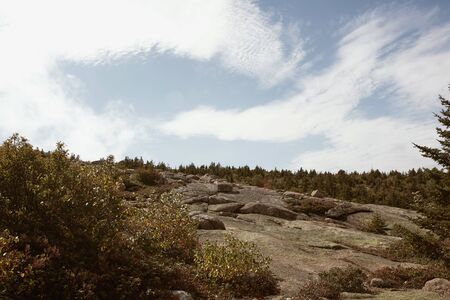 Hiking in Acadia National Park along granite bedrock of Cadillac Mountain on a cool Fall day.