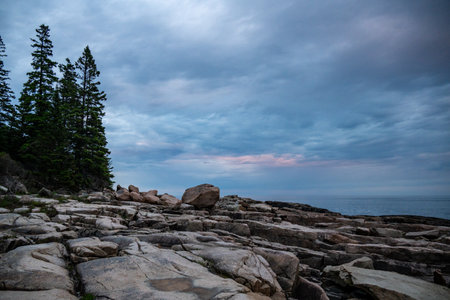 Rugged cliffs of Ocean Path along the shoreline of Acadia National Park in Mount Desert Island, Maine after sunset.