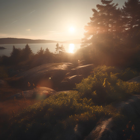 autumn sunrise illuminating the rocky shore of rocky point shoreline. this stunning image, captured in the style of cryengine, showcases highly detailed foliage in dark orange and red hues. with its uhd resolution, this american scene painting-like photograph resembles a national geographic masterpiece, offering a high-resolution visual treat. ai generated