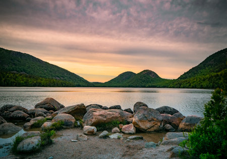 A beautiful view of a river and mountain forests at sunset in Arcadia National Park, Maine