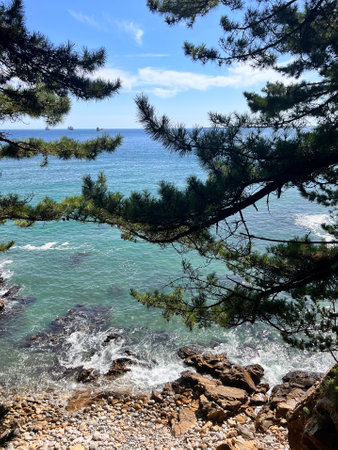 a stunning seascape captured on the rocky shore of hestiasula head in the uk. the photo showcases a plateau surrounded by pine trees near the psychology house in northern finland. the rough sea with big waves crashing on the rocks adds to the naturalism and high dynamic range of the image. shot with a canon eos r5 f1.2 lens at iso100 and 35mm, the photo
