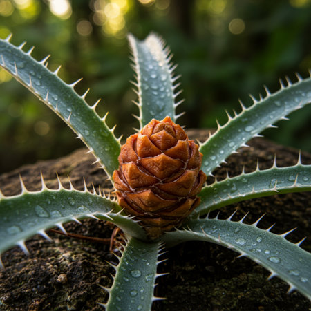 This striking close-up image features a unique spiky plant resting on a rocky surface, illuminated by warm afternoon sunlight. The intricate details highlight the beauty of nature.