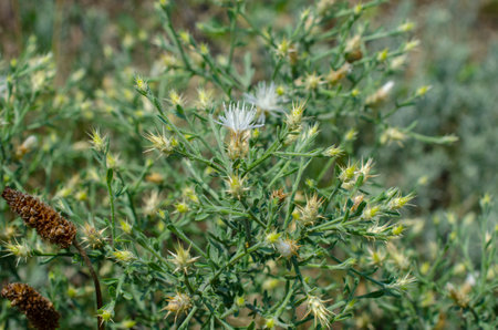 Closeup of the white flowers of Thistle plant (Centaurea cyanus)