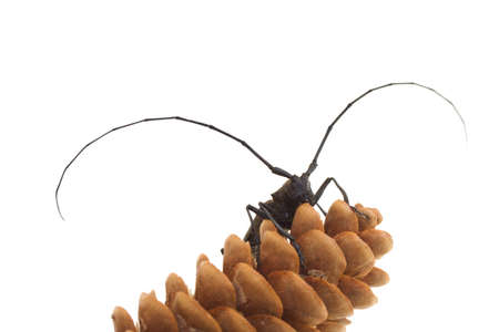 grey beetle (capricorn beetle) with lengthy feelers on cone isolated on white