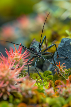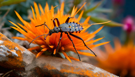 Close up of a Black Insect Navigating Vibrantly Colored Plants in a Lush Garden Environment, with Focus on Detail and Natural Habitat AI Generative