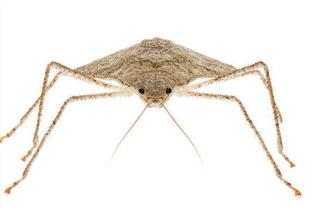 fascinating water scorpion displays its unique structure, with a long, slender body and sharp tail prominently extended, all set against a clean white background.