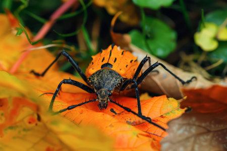 Very large beetle with long mustaches sits on the inflorescence of the cow grouse