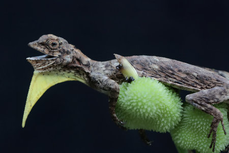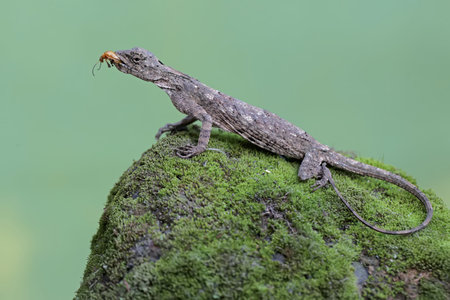 Body gesture of a forest dragon (Gonocephalus chamaeleontinus) who is ready to attack the intruding animals that enter its territory.