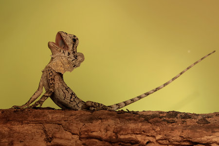 The frilled dragon baby (Chlamydosaurus kingii) is showing aggressive behavior.