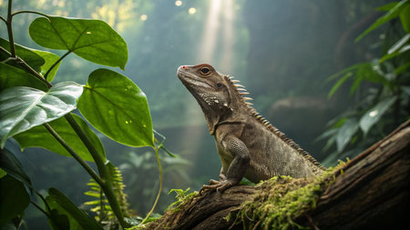 A brown basilisk (Basiliscus vittatus) or the common or striped basilisk lizard on a large leaf in the rainforest.