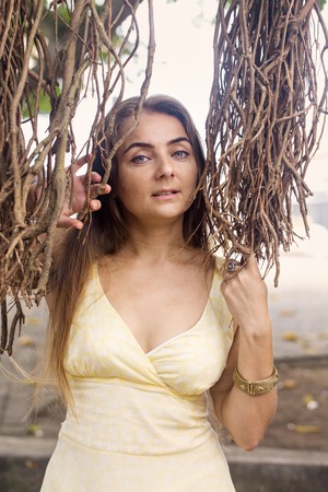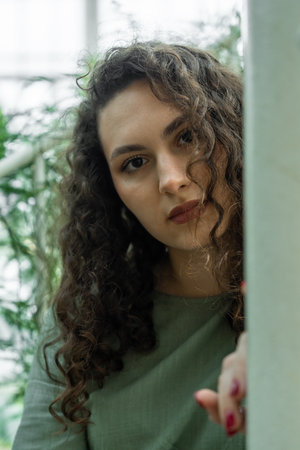 Girl with dark wavy hair peeks out from behind pillar, with green foliage in greenhouse in background. Concept of lightness, harmony with nature and ease.