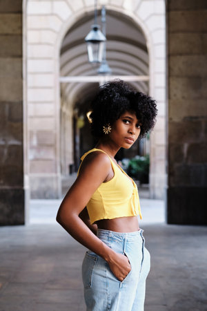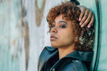 Attractive dark skin girl portrait. City hipster young woman walking on street